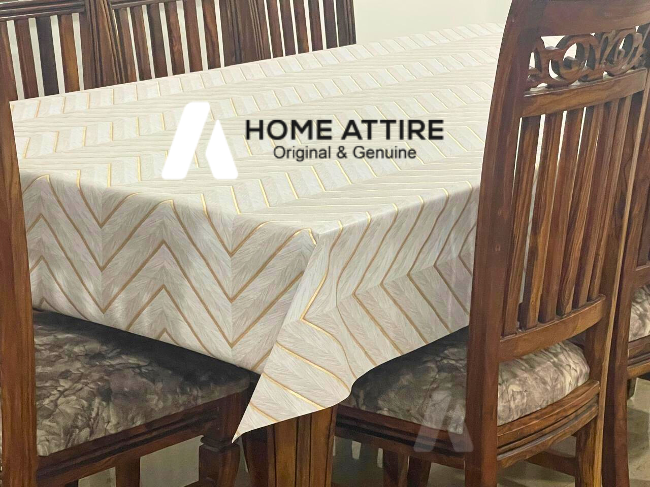Upgrade your dining space with this modern chevron PVC dining table cover by Home Attire. Featuring a stylish grey and gold zigzag chevron design, it adds a sleek and contemporary look to your dining room. Crafted from durable waterproof and heat-resistant PVC material, this tablecloth protects your dining table from spills, stains, scratches, and hot dishes.